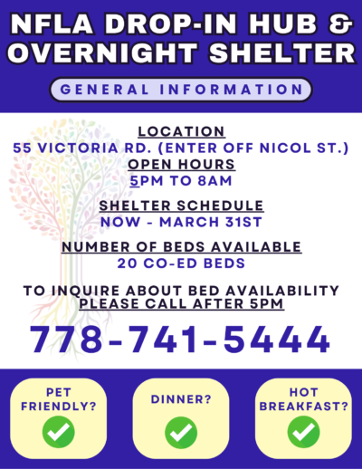 Located at 55 Victoria Road in the heart of Nanaimo, BC, the NFLA Hub Temporary Winter Shelter offers a vital service for those in need during the colder months of the year. Open from 5:00 PM to 8:00 AM every night, seven days a week, the shelter provides a warm, safe, and supportive environment for individuals experiencing homelessness or housing instability.