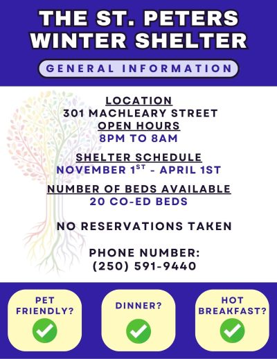 The St. Peters Temporary Winter Shelter is a shelter based at the St. Peters Roman Catholic Church at 301 Machleary street in Nanaimo